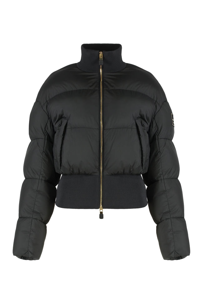 Cropped down jacket in technical fabric with an oversized fit. Voluminous and feminine, it features a collar and elastic waistband made of knit, welt pockets with zip and zip closure. The tone-on-tone patch embroidered with the logo on one sleeve completes the garment. Made of a durable material, it is perfect for completing casual and trendy outfits during the winter season.